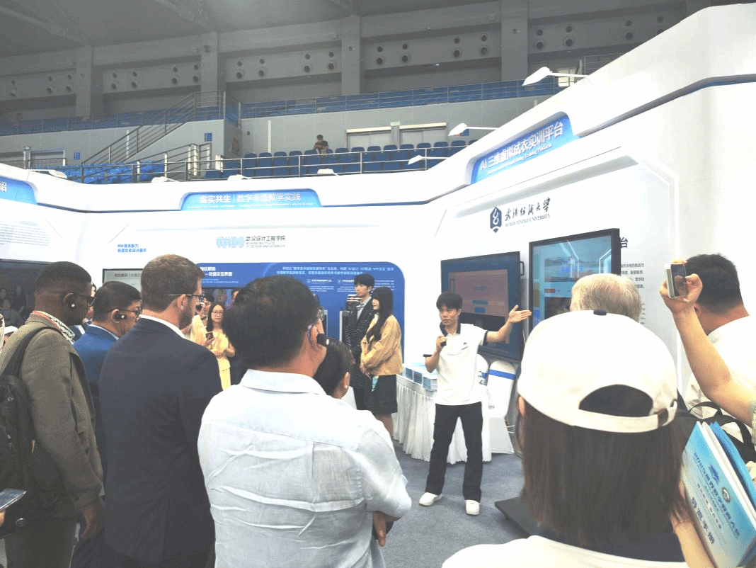 大会期间,我校AI 3D虚拟试衣实训平台吸引了众多国际嘉宾驻足。针对“如何实现3D虚拟数字人重建”的核心问题,周华科从容地进行了回应:“We use the technologies of Point cloud alignment. It can match the points of our body. It can match the posture and the spatial position of our body in the coordinate system. Then we collect the points of our body from six different surfaces to construct a virtual 3D human body online. Then,the training platform can provide users with proper clothing and enable users to try on different clothes in different scenarios.(我们通过点云配准技术,从六个角度采集人体数据点,运用空间坐标匹配技术精准还原人体姿态与结构,短时间内即可完成虚拟三维人体建模。)”这一技术解答获得国外官员的高度认可,他们对我校在数字人重建领域的技术突破表示赞赏。嘉宾们还围绕平台的教学应用展开提问,周华科都用流利的英语进行了回答。详实的案例与专业的英语解答,展现了外国语开元kaiyuan(中国)在培养研究生翻译实践能力与创新思维方面的显著成效。