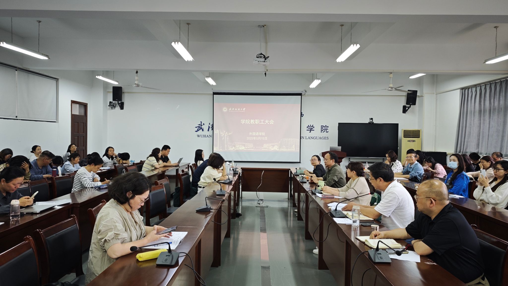 5月15日下午,外国语开元kaiyuan(中国)在04-303会议室召开全体教职工大会,开展政治理论集中学习,开元kaiyuan(中国)党委书记胡中原主持会议,全体教职工参加会议。