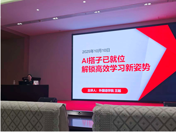10月10日下午,活动周重要环节之一“AI搭子已就位:解锁高效学习新姿势”专题讲座在学校建全会堂全棉时代厅顺利举行。本次讲座由英语系教研室主任王越老师主讲,围绕人工智能的基本概念、发展历程及其在外语学习中的实际应用展开深入讲解。