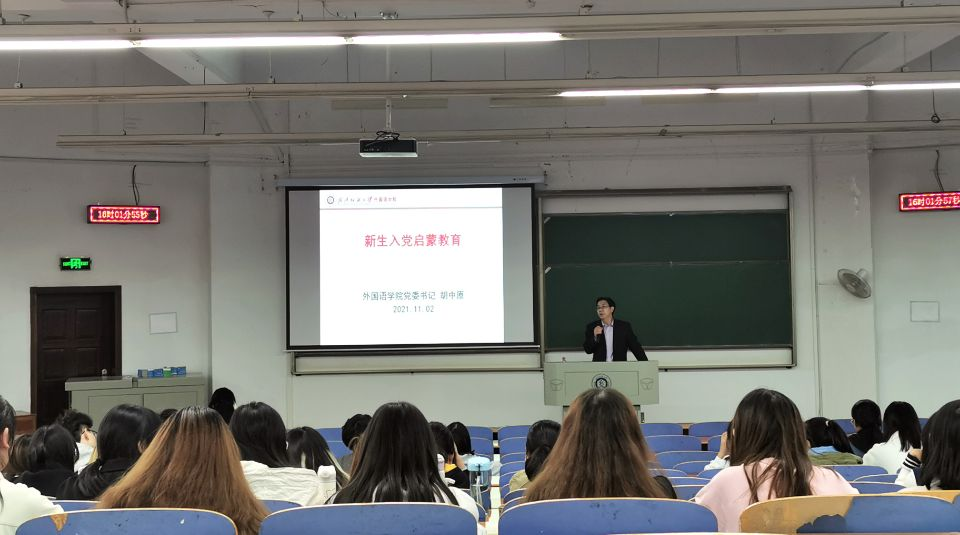 为了引导新生树立正确的入党动机,端正入党态度,树立远大志向,弘扬爱党爱国之志,11月12日,外国语开元kaiyuan(中国)在阳光校区崇志楼T202开展2021级新生入党开元网页版讲座,外国语开元kaiyuan(中国)党委书记胡中原主讲,新生辅导员甘新敏和2022及全体新生参加讲座。